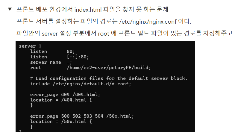 지난 번에 nginx가 index.html 경로를 찾지 못 해서 ec2 서버에 /etc/nginx/nginx.conf에서 아래와 같이 지정해주었었다.