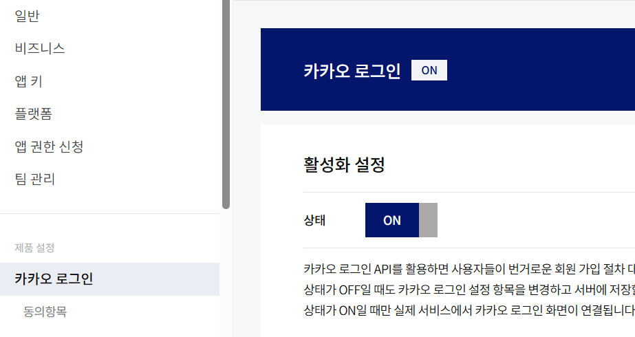 기본 정보 입력 후 생성해주고 카카오 로그인 기능을 사용할 것이기 때문에 활성화 설정에 ON으로 바꿔준다.