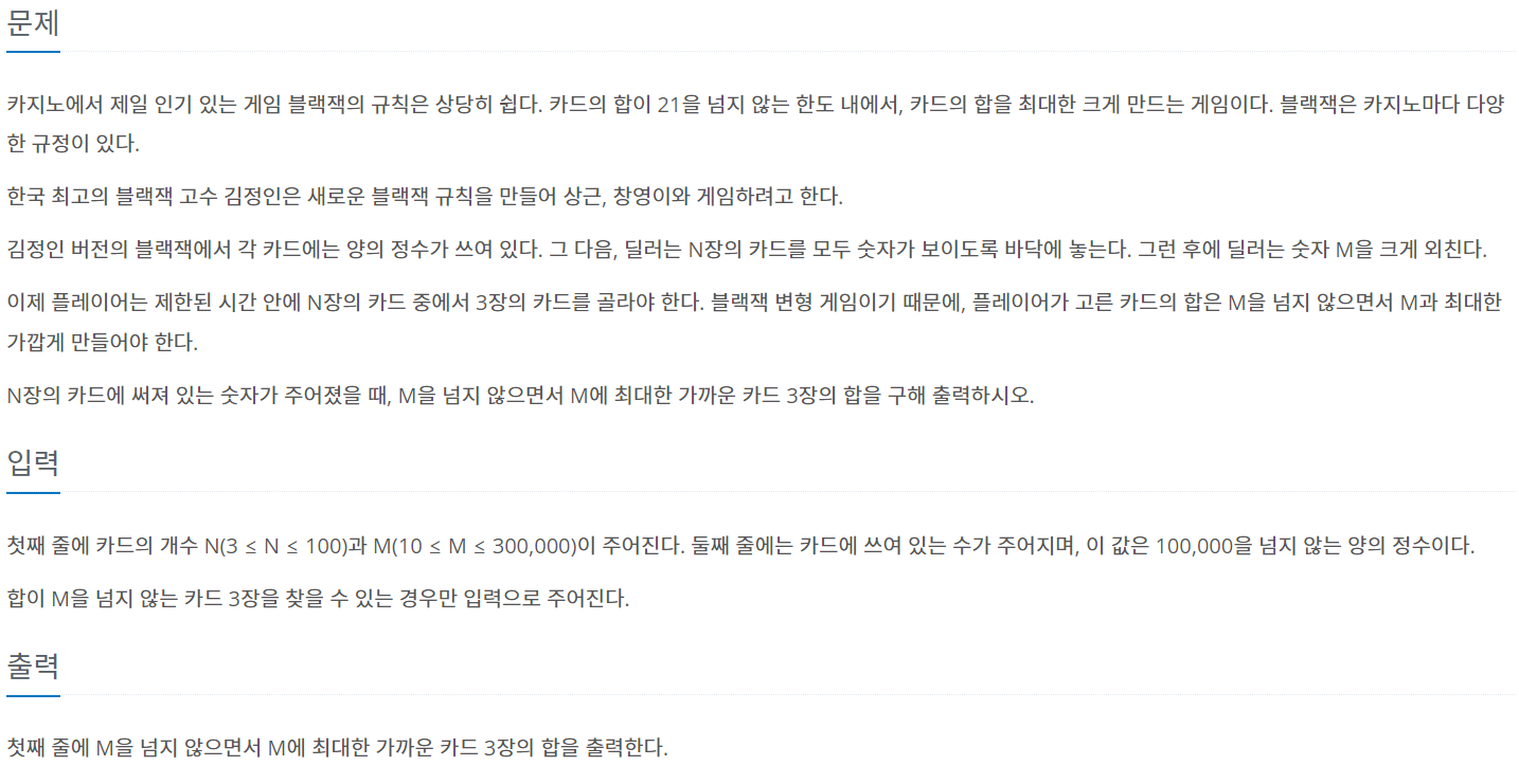 첫째 줄에 카드의 개수 N(3 ≤ N ≤ 100)과 M(10 ≤ M ≤ 300,000)이 주어진다. 둘째 줄에는 카드에 쓰여 있는 수가 주어지며, 이 값은 100,000을 넘지 않는 양의 정수이다. 합이 M을 넘지 않는 카드 3장