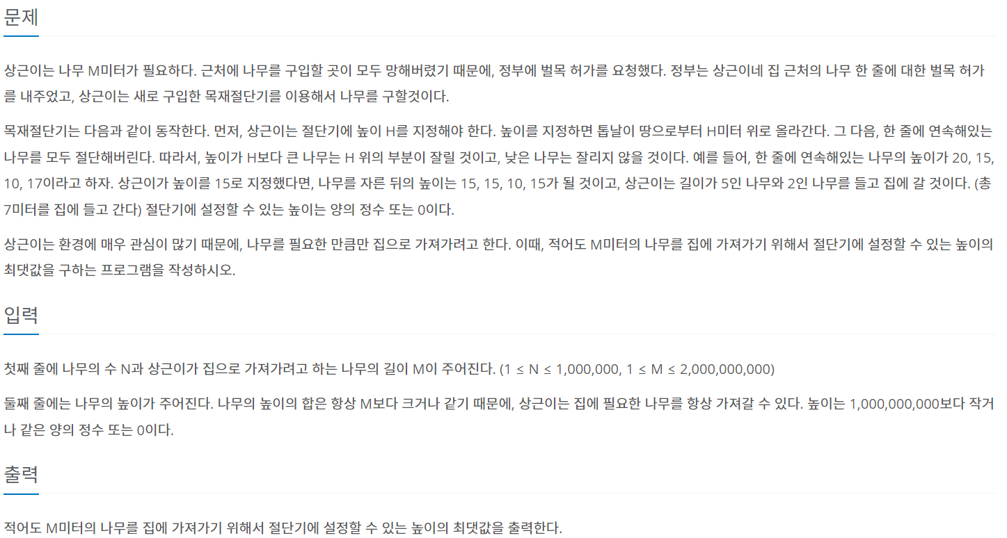 첫째 줄에 나무의 수 N과 상근이가 집으로 가져가려고 하는 나무의 길이 M이 주어진다. (1 ≤ N ≤ 1,000,000, 1 ≤ M ≤ 2,000,000,000) 둘째 줄에는 나무의 높이가 주어진다. 나무의 높이의 합은 항상 M보