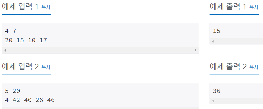 첫째 줄에 나무의 수 N과 상근이가 집으로 가져가려고 하는 나무의 길이 M이 주어진다. (1 ≤ N ≤ 1,000,000, 1 ≤ M ≤ 2,000,000,000) 둘째 줄에는 나무의 높이가 주어진다. 나무의 높이의 합은 항상 M보