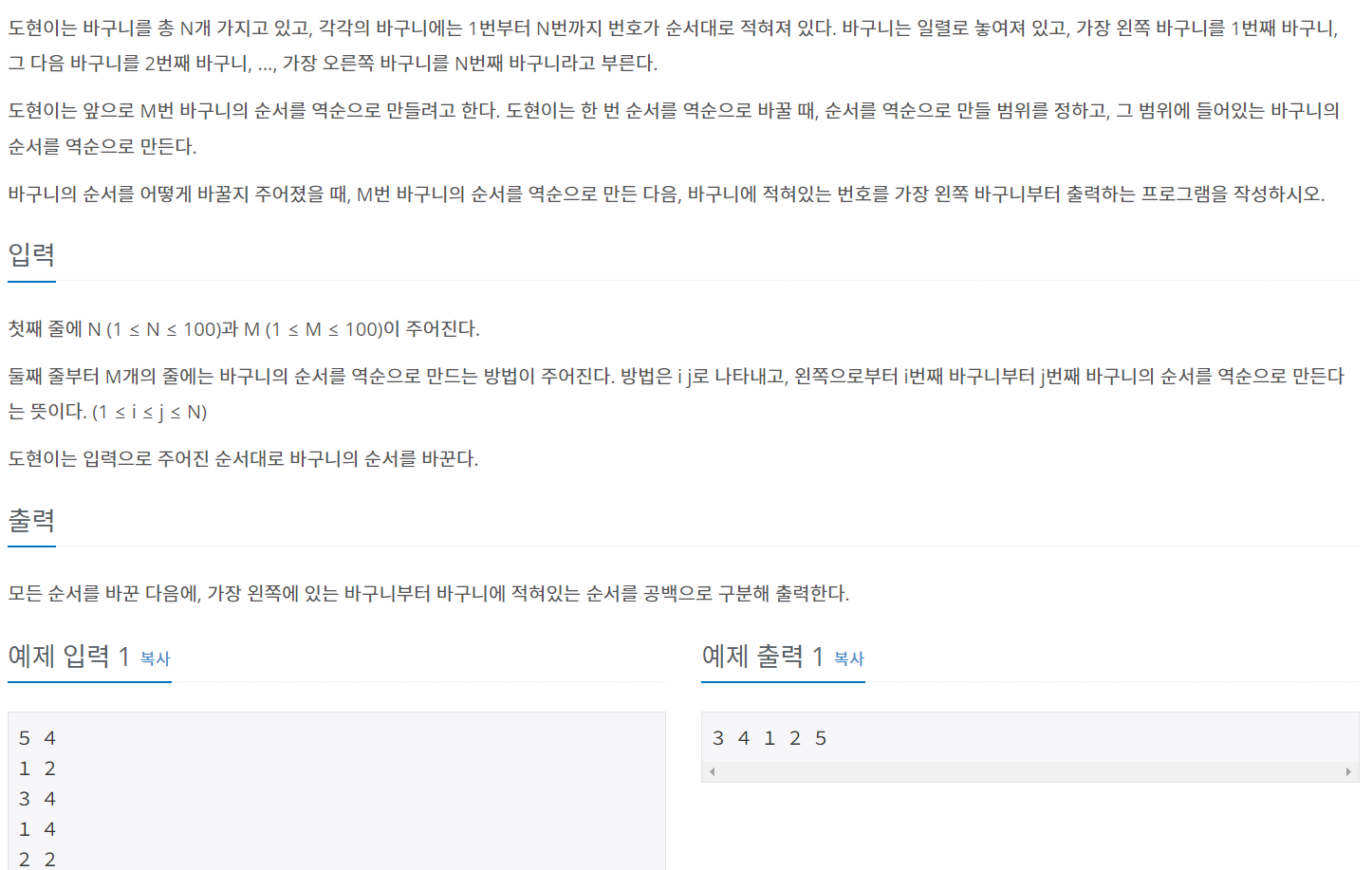 도현이는 바구니를 총 N개 가지고 있고, 각각의 바구니에는 1번부터 N번까지 번호가 순서대로 적혀져 있다. 바구니는 일렬로 놓여져 있고, 가장 왼쪽 바구니를 1번째 바구니, 그 다음 바구니를 2