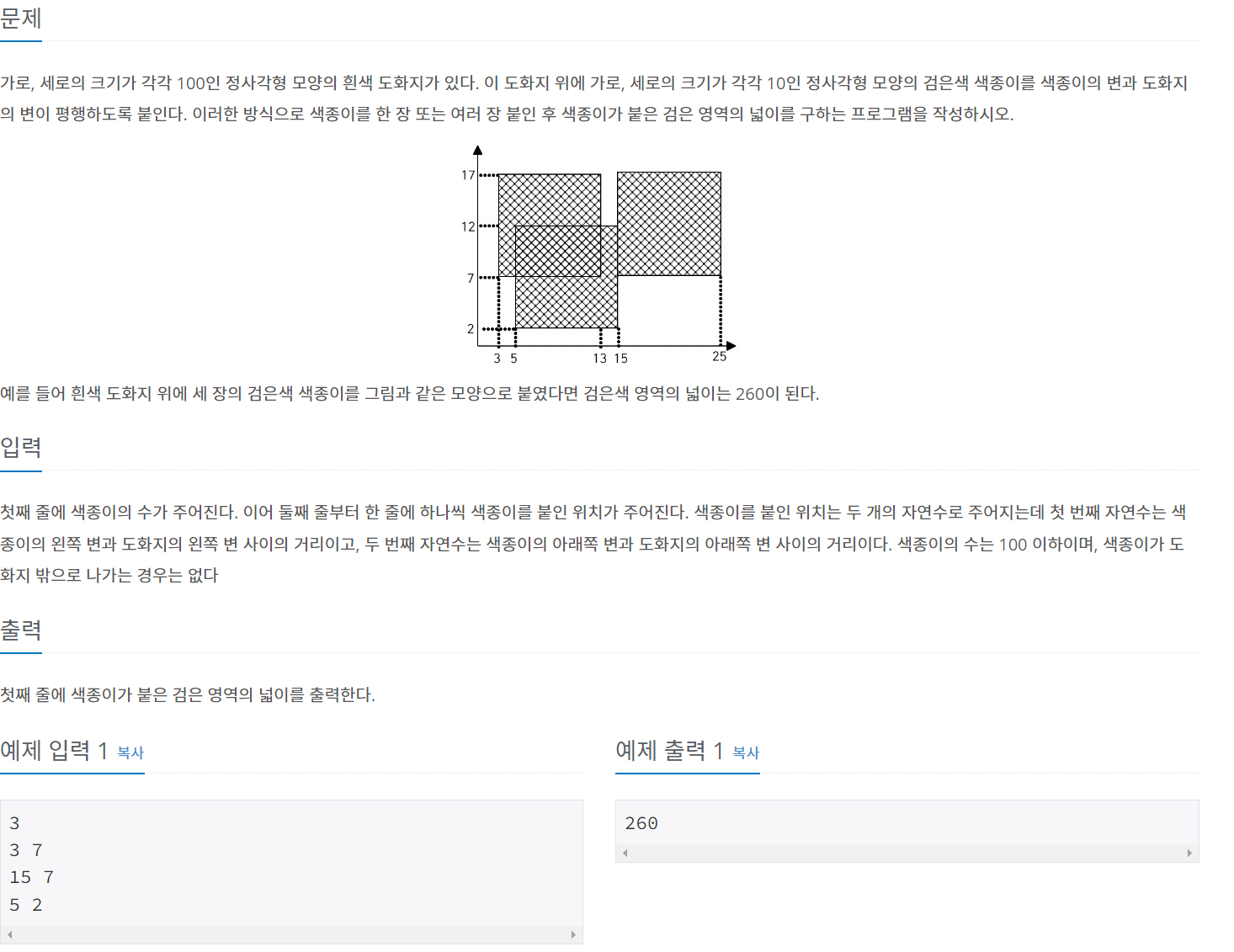 가로, 세로의 크기가 각각 100인 정사각형 모양의 흰색 도화지가 있다. 이 도화지 위에 가로, 세로의 크기가 각각 10인 정사각형 모양의 검은색 색종이를 색종이의 변과 도화지의 변이 평행하도록