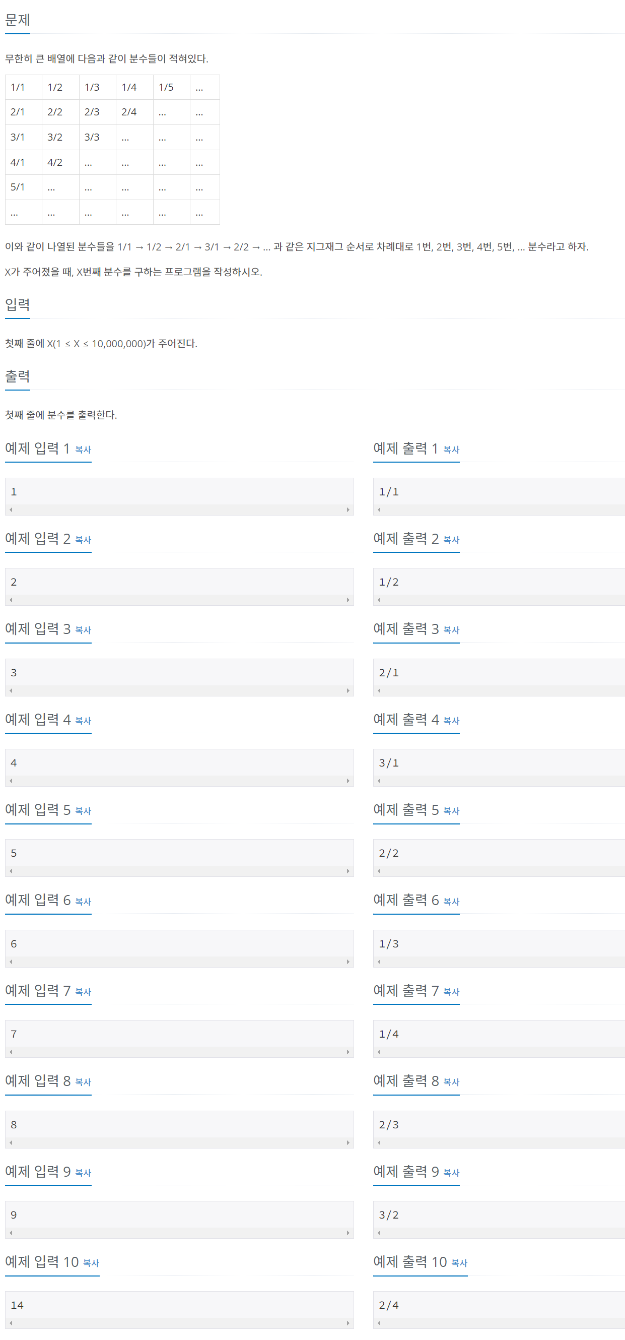 짝수번째 덩어리는 분모는 N까지 증가, 분자는 N부터 1까지 감소하는 거를 알 수 있었다.