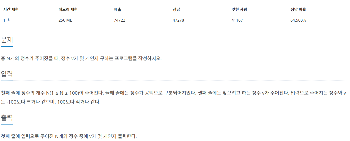 첫째 줄에 정수의 개수 N(1 ≤ N ≤ 100)이 주어진다. 둘째 줄에는 정수가 공백으로 구분되어져있다. 셋째 줄에는 찾으려고 하는 정수 v가 주어진다. 입력으로 주어지는 정수와 v는 -100보다 크거