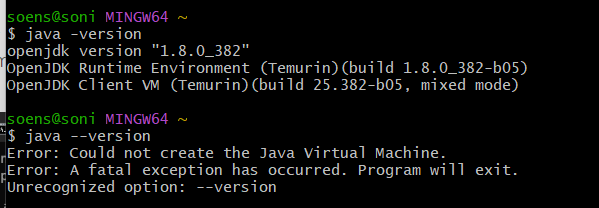 이렇게 다 디폴트로 설정해줬는데 이제는 또 아까까지 잘 사용하던 java --version은 안 되고 java -version으로 하면 애초 시스템 환경변수에 지정해줬떤 1.8 버전이 뜬다 ㅠㅠㅠ 뭐지