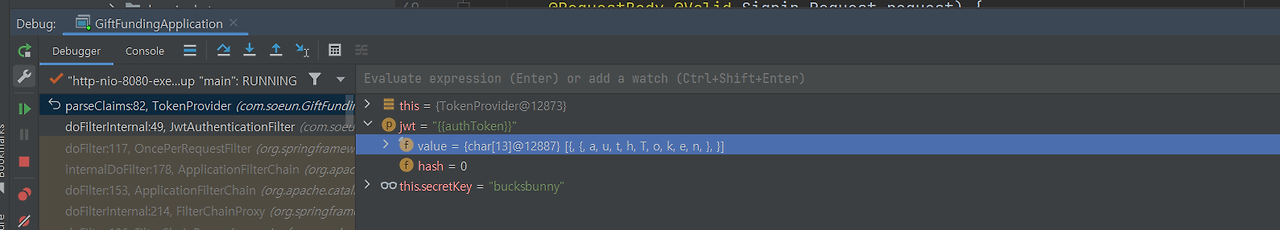 디버그를 걸어서 확인해보니까 jwt로 authToken이라는 postman에서 환경설정으로 걸어준 문자열이 넘어온 것을 확인했다.