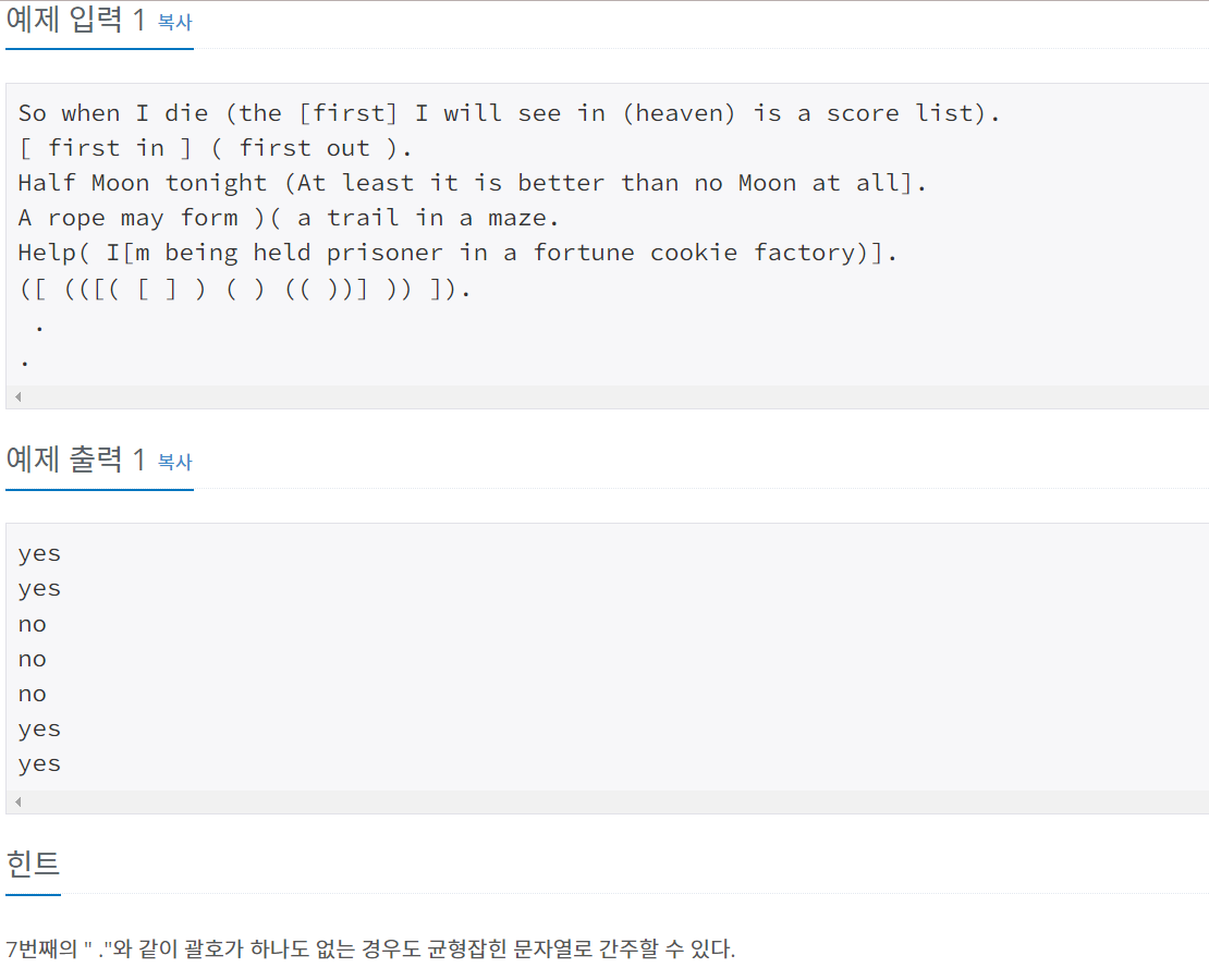 각 문자열은 마지막 글자를 제외하고 영문 알파벳, 공백, 소괄호("( )"), 대괄호("[ ]")로 이루어져 있으며, 온점(".")으로 끝나고, 길이는 100글자보다 작거나 같다. 입력의 종료조건으로 맨 마지막에